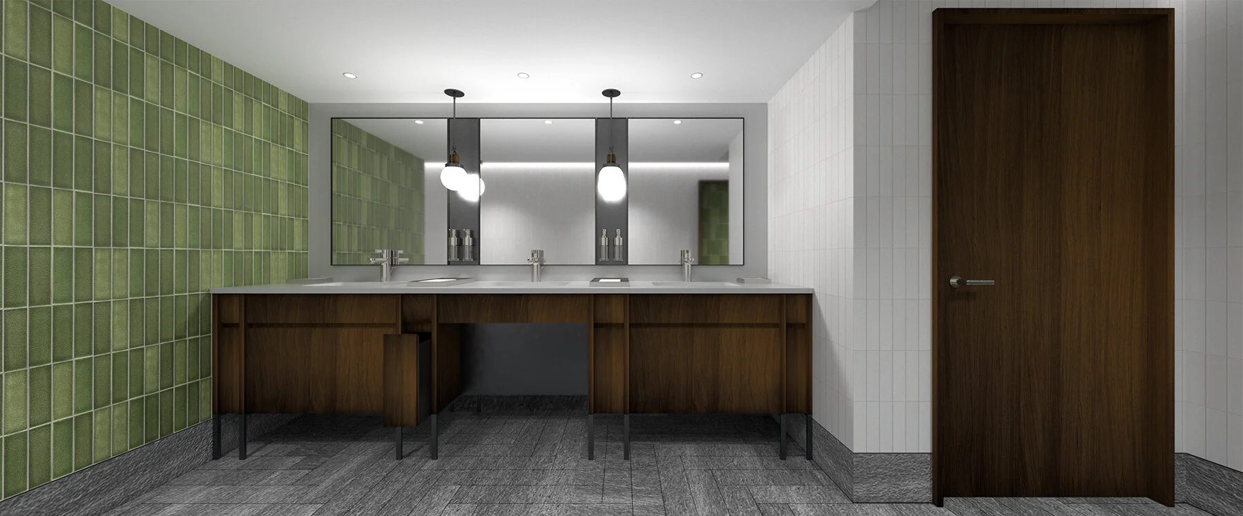 As part of larger design upgrades of the event spaces throughout Chelsea Piers, the primary bathrooms of Pier 61 were targeted for an immediate upgrade that would reflect the overall design vision being implemented in phases. Maintaining the same footprint and infrastructural backbone, the design re-shapes the ceiling plane to mine as much vertical dimension as possible. Fields of hand-glazed green tile and warm, walnut wood details attempt to domesticate and “de-institutionalize” the long rooms.