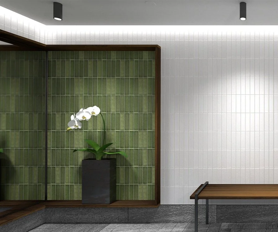Blackened steel details, modeled porcelain tiles cut in herring bone patterns, and ornamental light fixtures add a level of nuance to the rooms. An over-deep wooden frame wraps a field of bright tile, a flower vase, and a flush mirror that composes a still-life with the guest before returning to the Gala.