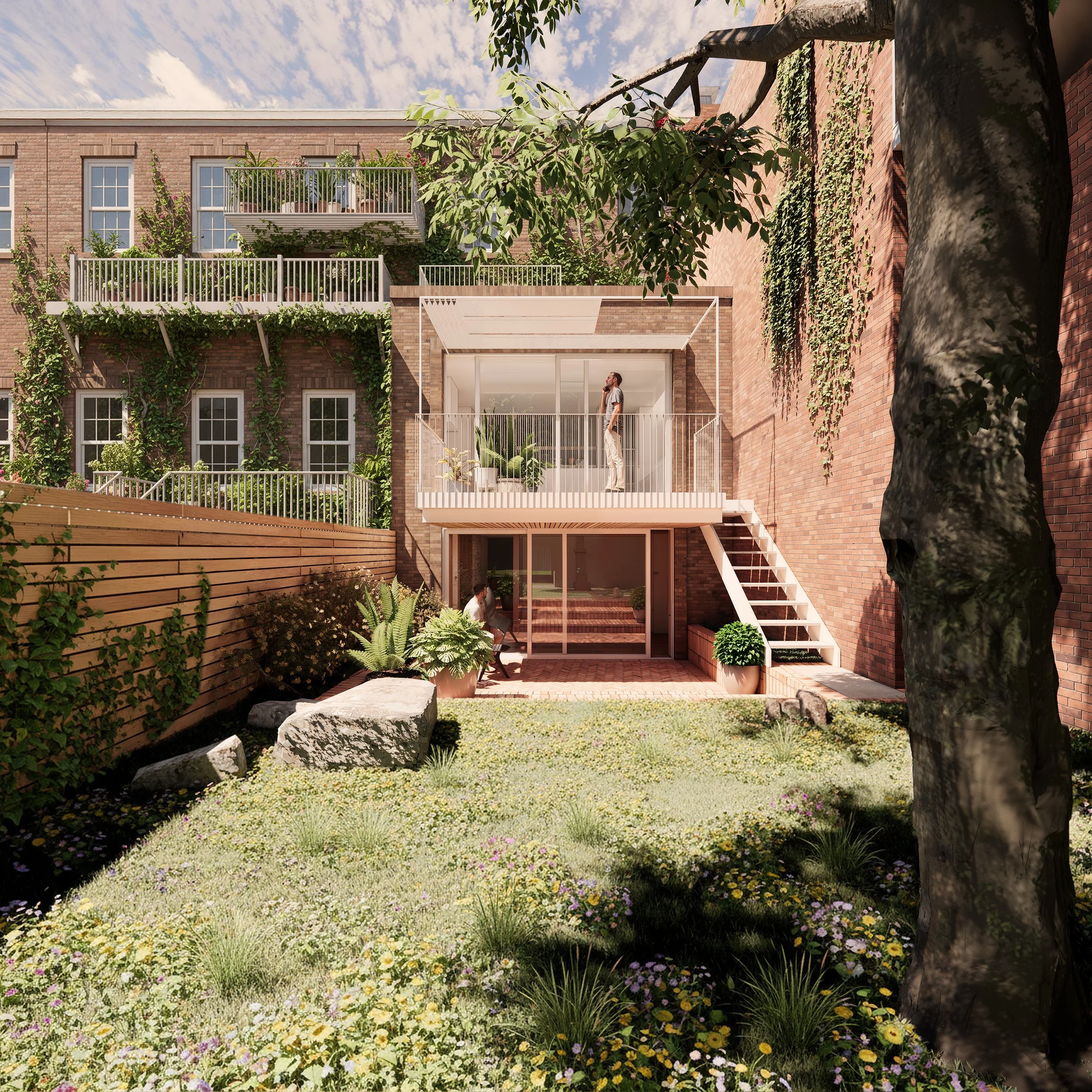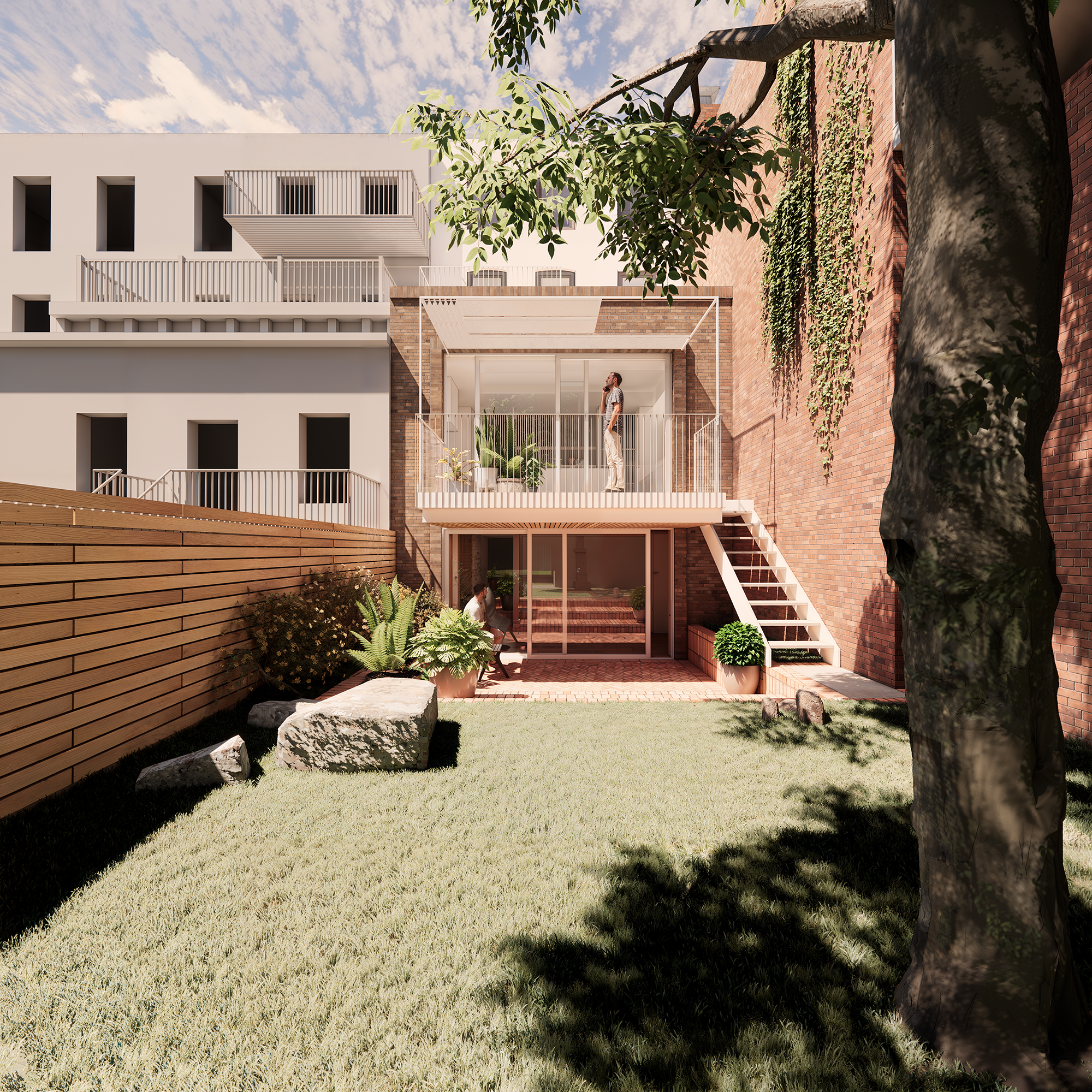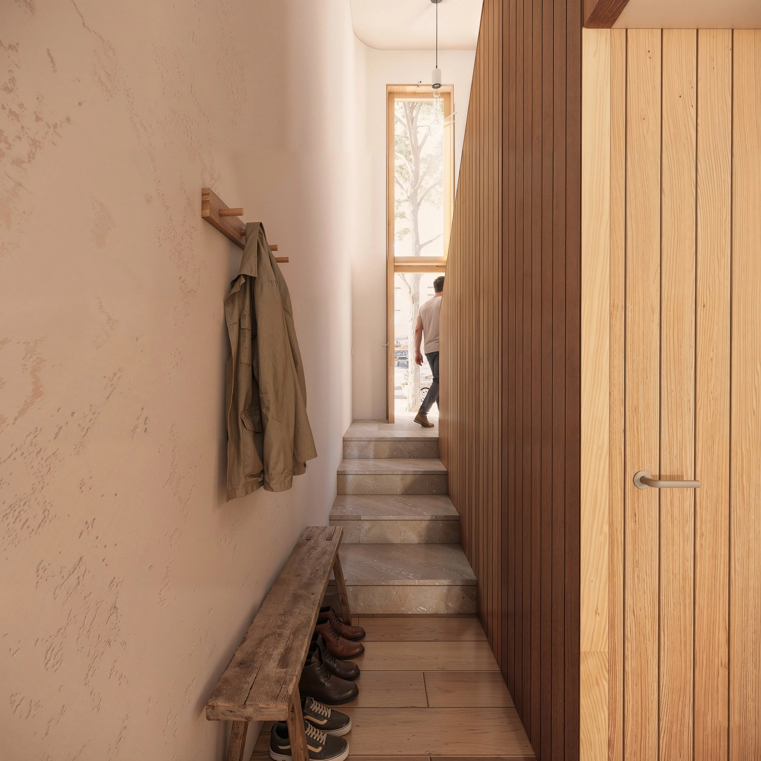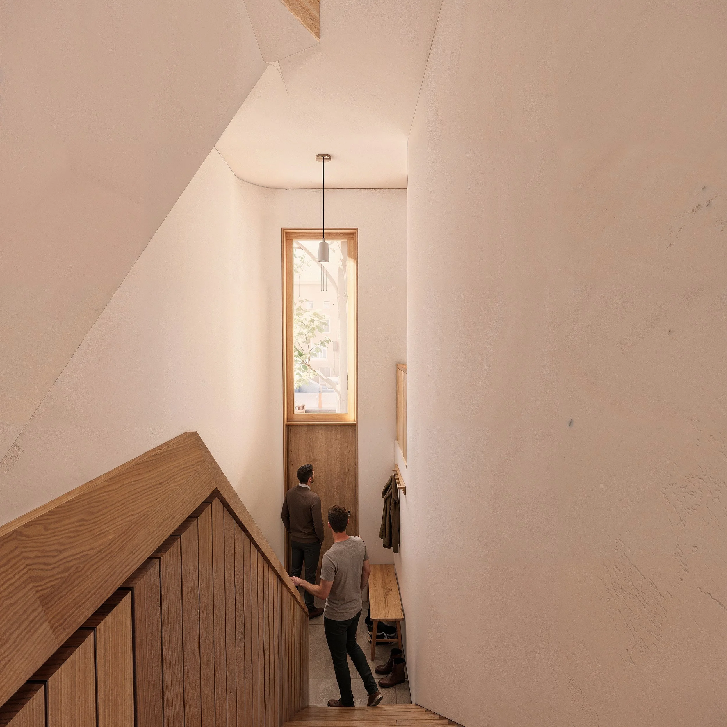 The original stair, no longer code-compliant, offered a chance to reframe the entry sequence. Aligned with the new stoop and semi-private Garden level, the redesigned stair establishes a clear hierarchy guiding visitors directly upward to the Kitchen and Living areas and reinforcing a purposeful sense of arrival.