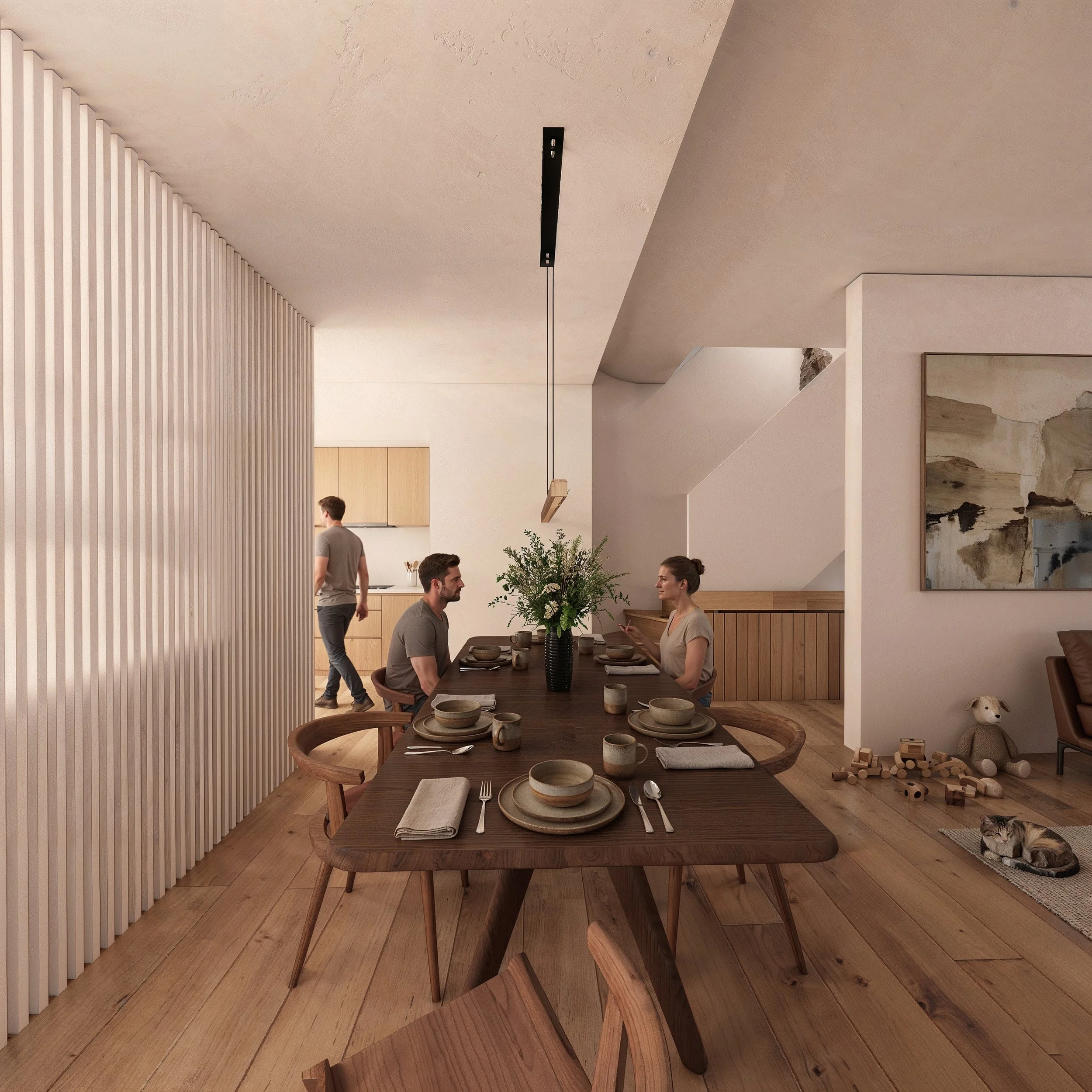 Arriving at the parlor level, a clear vista extends toward the rear garden, framed by a full-height screen of pickled white wood battens. This delicate partition subtly delineates the kitchen from the living and dining spaces, preserving visual continuity while allowing light and air to move freely throughout the floor.