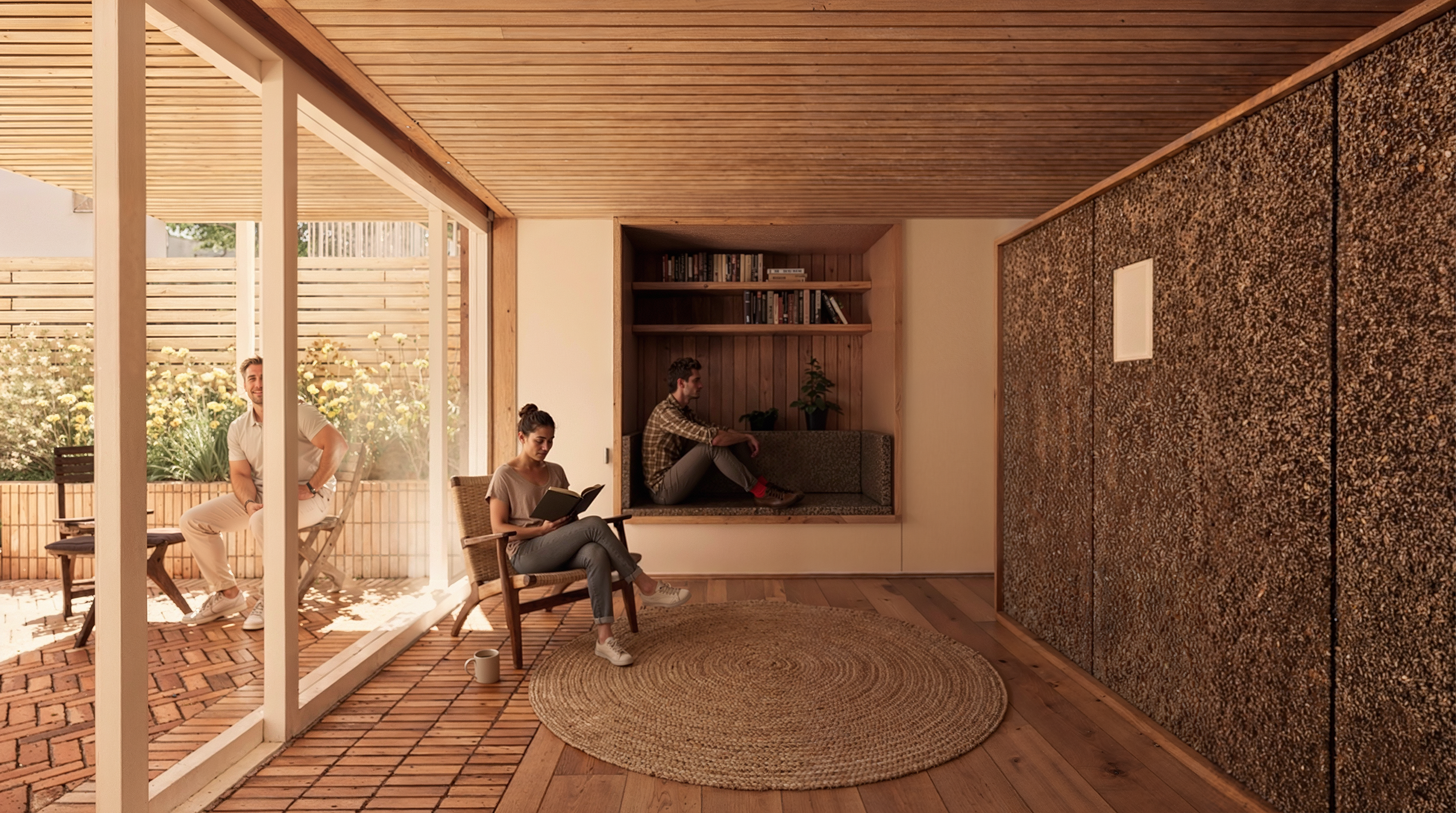 A series of flexible spaces including nooks, playrooms, a home office, a main bedroom suite, and two additional bedrooms support the evolving needs of a growing family. A rich material palette, paired with selective pops of color, brings a sense of warmth and playfulness to the design.